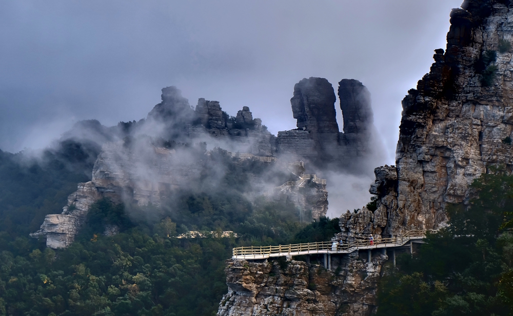 悬于海拔1900米的高空,一边是刀削绝壁,一边是沟谷悬崖,它遵循大自然的原生之态,采用古 代巴蜀古栈道营造法,结合现代钢筋砼的施工工艺,完美展示了天地人神的神奇造化。
